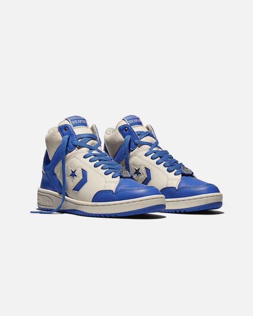 El segundo modelo de la colección eleva el nivel de terminación con una capellada de cuero premium desgastado, perforada con ondas de sonido en la puntera, un guiño directo al rol de la música dentro de la serie. La paleta cromática se apoya en archivos originales de las Converse Weapon de los años 80, reforzando el clima nostálgico.
