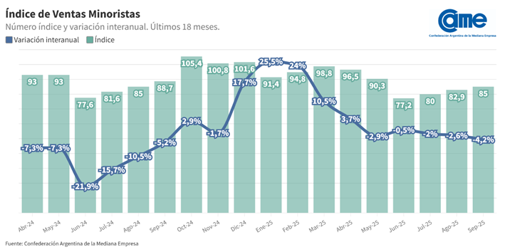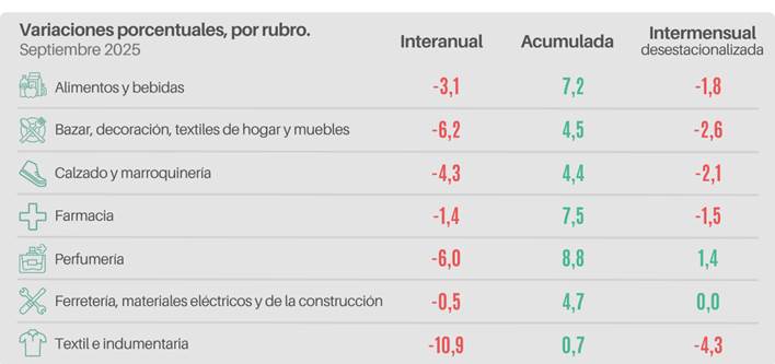 En el análisis general, las ventas minoristas pymes bajaron un 4,2% interanual en septiembre y un 2% respecto de agosto, reflejando la fragilidad del consumo interno, la pérdida de poder adquisitivo y la cautela del consumidor frente a la incertidumbre económica.
